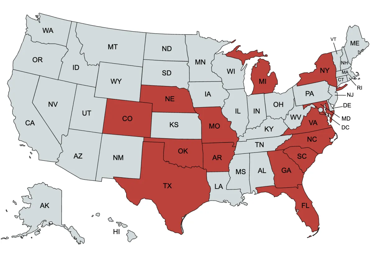 New York, Florida, Texas, Colorado, Oklahoma, Virginia, Georgia, Nebraska, Missouri, North Carolina, South Carolina, Michigan, Maryland and Arkansas.
